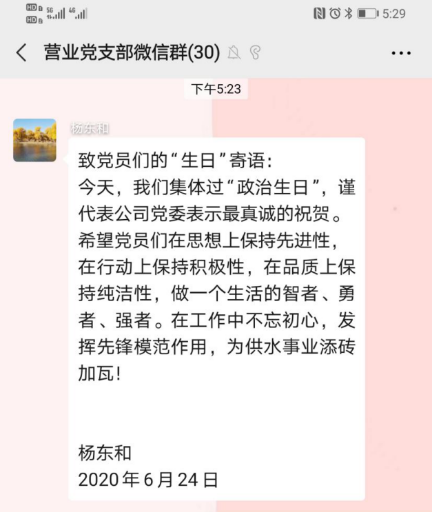 烏海市海勃灣城市供水有限公司為進(jìn)一步增強(qiáng)主題教育的吸引力和感染力,于6月24日開展黨員“過政治生日,憶入黨初心”主題黨日活動(dòng)。五個(gè)黨支部分別在完成奏唱國歌、重溫入黨誓詞、領(lǐng)誦黨章、繳納黨費(fèi)、學(xué)習(xí)政治理論后為黨員過“政治生日”。