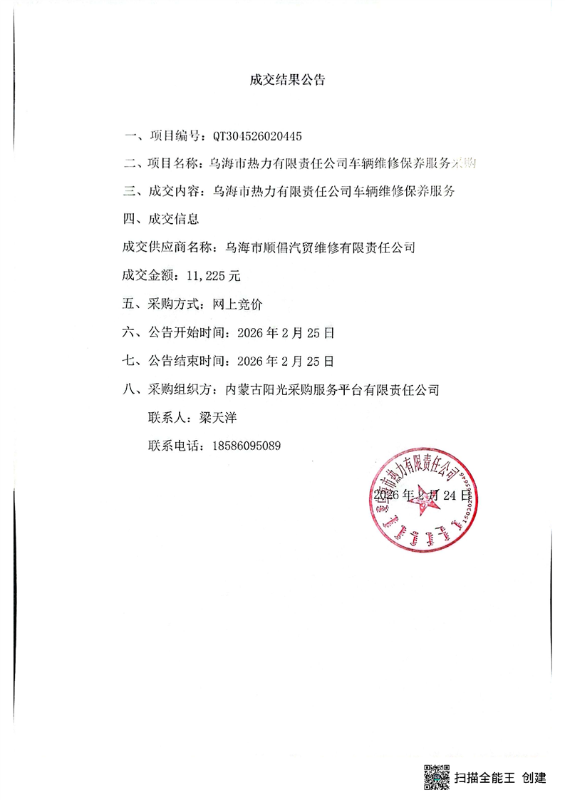 烏海市熱力有限責(zé)任公司車輛維修保養(yǎng)服務(wù)采購(gòu)成交結(jié)果公告